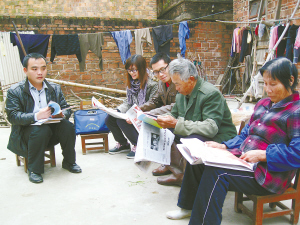 茂名化州市大學生村官顏伯威(左一)深入農戶家中宣傳惠農政策。唐競攝