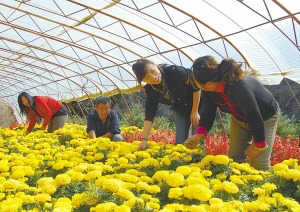 遼寧省阜新市太平區水泉鎮前營子村書記助理劉奕彤大力推廣花卉種植技術,在村里成立了花卉種植合作社,帶領農民抱團闖市場。圖為劉奕彤(右二)與農民探討花卉銷售情況。