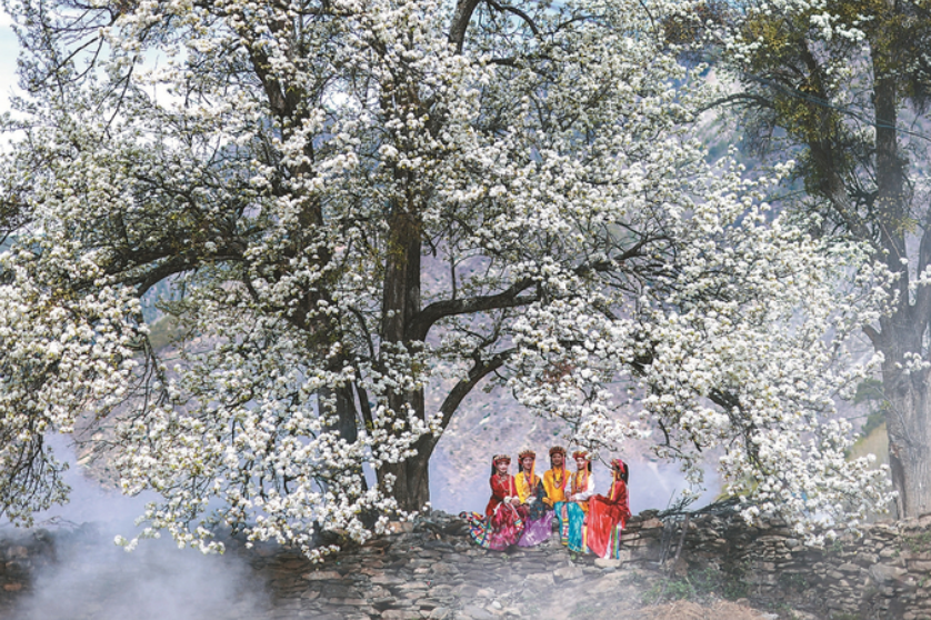 丹巴姑娘身著嘉絨服飾,在梨花樹下賞春花。(丹巴縣委組織部供圖)