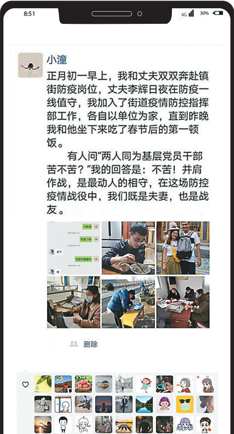 李曉彤和李輝新婚不久,突然而至的疫情打亂了小夫妻的“蜜月計劃”。丈夫李輝是招遠(yuǎn)市畢郭鎮(zhèn)政府黨政辦負(fù)責(zé)人,大年初一早上就回到工作崗位。妻子李曉彤也主動請纓,參與包村疫情防控。40多天來,夫妻倆吃住在單位,每天通過微信相互問候。