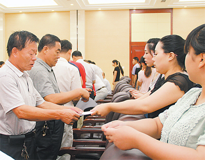 大學(xué)生村官向村黨組織書記遞交村委會委員參選承諾書。