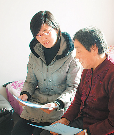 寶坻區(qū)周良莊鎮(zhèn)周良莊村委會委員劉春平(左) 到村民家中宣傳城鄉(xiāng)居民養(yǎng)老保險政策。