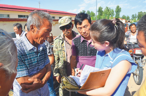 內蒙古鄂爾多斯市準格爾旗組織大學生村官定期走村入戶向村民宣講最新政策。上圖為大學生村官閆婷走進十二連城鄉柴登村宣傳政策、了解民情。 屈彥佼供圖
